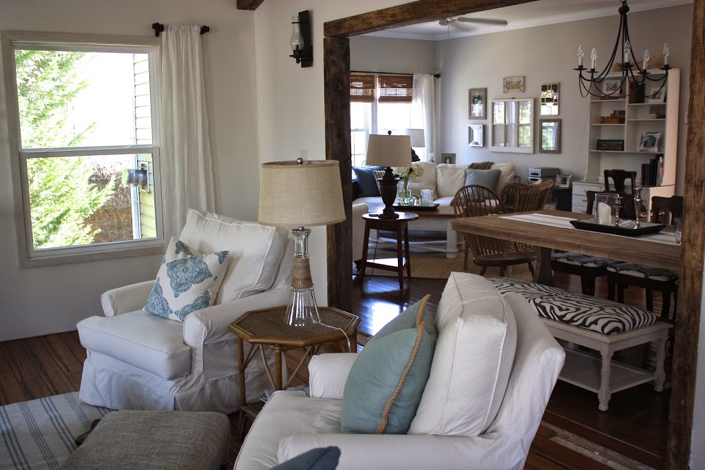 The sofa and chairs are all part of my furniture line Simplicity – cozy and comfortable and slipcovers are washable:) Scott has already done a great job with breaking his chair in! This gorgeous unique coffee table, my talented hubby made from pallets then he did a light whitewash over it and finished with a lime wax- fits perfectly in this room. The rug is from Dash & Albert, another great line we carry at Simplicity Interiors shop!
